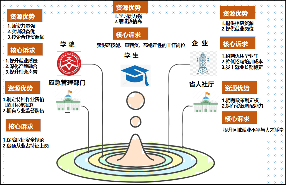 針對上述問題,學院精準識別利益相關方,通過“校政合作取證、校企合作育才、雙線協(xié)同育人”,開辟高技能、高薪資、高穩(wěn)定性的高質量就業(yè)新賽道,為電力行業(yè)輸送優(yōu)質高技能人才,回應“實現高質量就業(yè)”的時代命題。