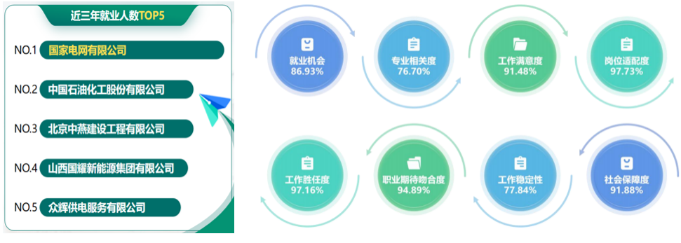 項目實施以來,學院工作質效和學生職業(yè)技能顯著提升,高質量就業(yè)問題得到解決。2022級學生持證率達92.18%,2024年在各類技能競賽中獲得國家級獎項10項、省級52項,持證學生成為人才市場的“香餑餑”。畢業(yè)生中,24.48%入職國企,其中累計考入國網公司系統(tǒng)215人(含主業(yè)109人、供服96人);75.52%入職其他企業(yè),學生工作滿意度達91.48%,高質量就業(yè)成效凸顯。