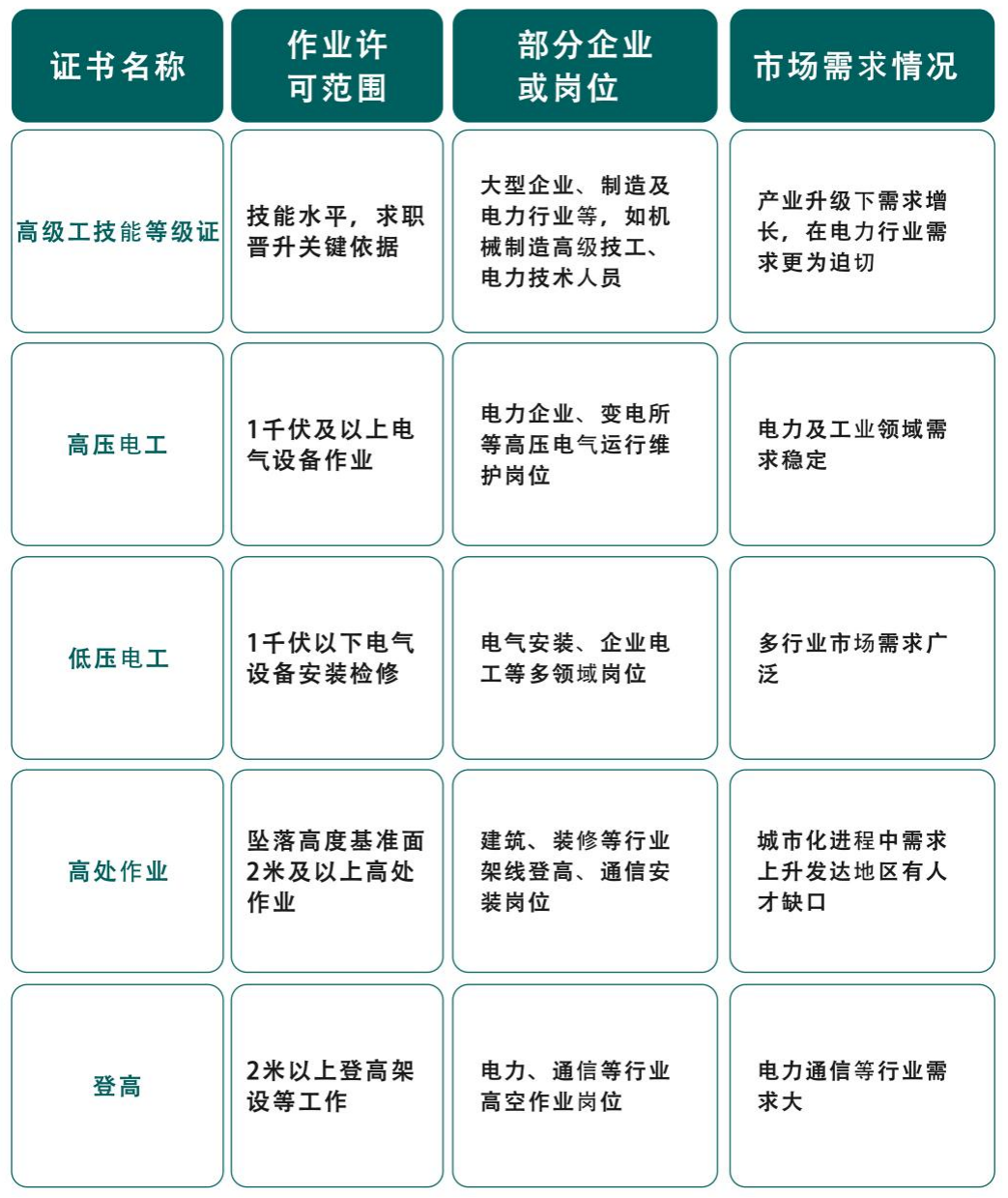 1.明確“取什么證”。通過深入調研23家企業(yè)及分析省人社廳發(fā)布的電力人才需求數據,精準鎖定高級工技能等級證(85%企業(yè)薪資依據)、高壓電工證(電網作業(yè)強制要求)、低壓電工證(需求年增12%)、登高作業(yè)證(高空作業(yè)必備)、高處作業(yè)證(降低事故率60%)。這些均為國家準入類資質,覆蓋電力行業(yè)92%崗位需求和80%高危作業(yè)場景,確保學生獲得的每一項資質都能直接提升就業(yè)競爭力和職業(yè)發(fā)展空間。