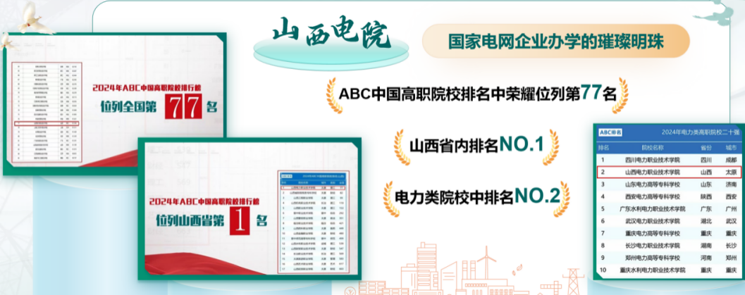 2024年ABC中國高職院校排名中,學院位列全國第77名、省內第1名、電力類院校第2名。率先開展的“1+4”取證工作在全省51所職業(yè)院校及國網系統(tǒng)內12所電力高職院校中獨樹一幟,形成可復制的高職高質量就業(yè)“電院方案”,彰顯國網公司在教育領域積極履行社會責任、推動行業(yè)發(fā)展的擔當與作為。