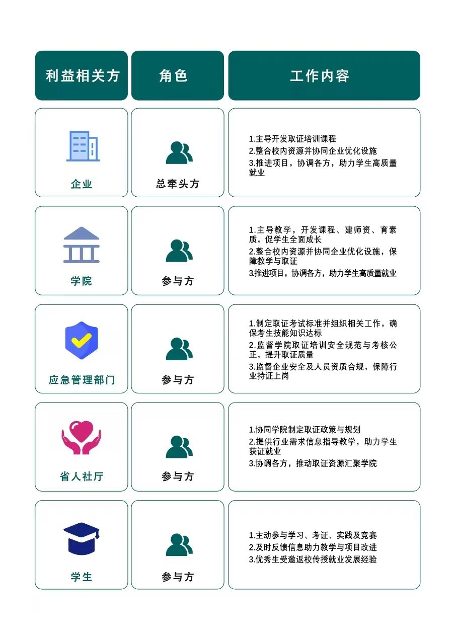精準識別企業(yè)、應急管理部門、省人社廳、學院、學生等利益相關方。通過深度調研(問卷+座談)梳理各方利益訴求,堅持“專業(yè)主導、協(xié)同聯(lián)動”原則,厘清利益相關方責任邊界,建立“需求對接-資源整合-方案共商”的協(xié)作模式,形成多方聯(lián)動就業(yè)質量提升方案。