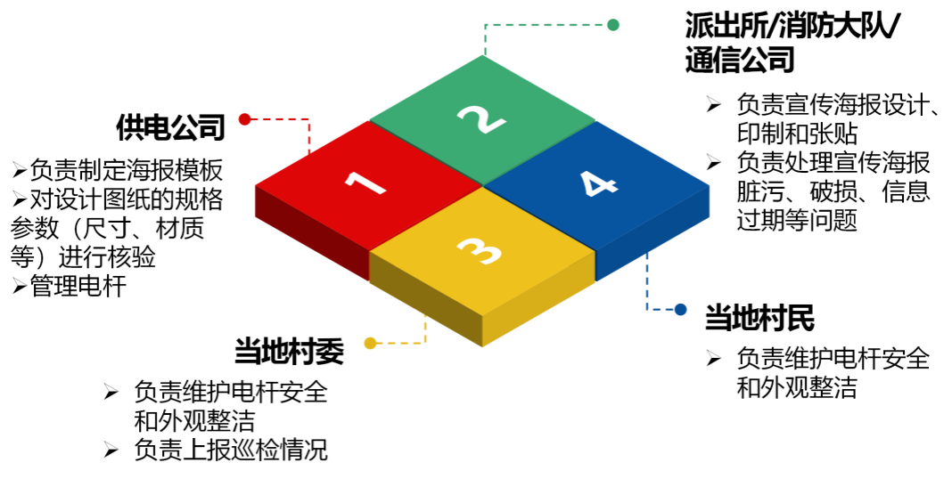 供電公司對內(nèi)發(fā)出調(diào)查問卷82份,結(jié)合80%以上人員意見,確定離地面2米左右電桿桿體為主體資源,與消防大隊、通信公司、派出所、屬地村委共同搭建以電桿為載體的合作平臺。通過理想邊界分析,劃定各方實施過程中的責(zé)任邊界,明確制作方、張貼方、管理方等相關(guān)方在實施過程中的責(zé)任,實現(xiàn)資源共享,各方合作共贏。
