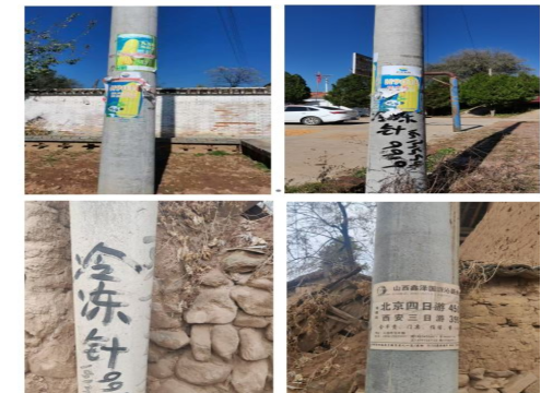 2023年,國網(wǎng)沁縣供電公司(以下簡稱“沁縣公司”)探索出利用廢舊電桿為鳥筑巢的方法,壓降在運線路跳閘率30%。這一實踐為自有電力設(shè)備資源的高效利用探索出新路徑。基于此,2024年沁縣公司進一步探索農(nóng)村在運電桿潛在價值釋放。經(jīng)調(diào)研,沁縣全域533個自然村,平均每個自然村有40基電桿,大約21320基電桿。60%電桿的桿體存在被亂涂亂畫、張貼小廣告等影響鄉(xiāng)村美觀的問題(如圖1),與鄉(xiāng)村振興的時代課題不相適應(yīng);5%緊貼路邊的電桿容易受外力撞擊,造成桿體破損,形成安全隱患;95%以上電桿桿體缺乏管理,電桿下端位置未被有效利用。
