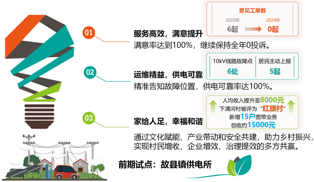 電桿文化宣傳,使居民掌握基本的安全用電、用網(wǎng)知識,電力設(shè)施外力破壞同比降低90%;學(xué)會對簡單故障的排查與處理,節(jié)約公司運維成本,如果按照平均往返15公里計算,每次可以節(jié)約油費11.25元。項目實施以后,該地區(qū)10千伏線路6處故障點,有5起為居民主動上報,并精準(zhǔn)告知網(wǎng)格經(jīng)理故障位置,縮短尋找時間,節(jié)約費用約3500元左右,2024年供電可靠率達(dá)到100%。通信公司通過宣傳減少線路私拉亂接率70%,網(wǎng)絡(luò)故障率同比下降30%,節(jié)約費用約9000元,在該村新增15戶寬帶業(yè)務(wù)辦理,增加約15000元營業(yè)收入。